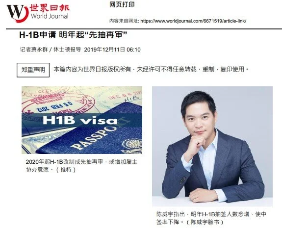 若对2020年H-1B申请有疑问,陈威宇将于12月27日在脸书举办线上讲座,详情请洽“美国移民律师-陈威宇”社团。