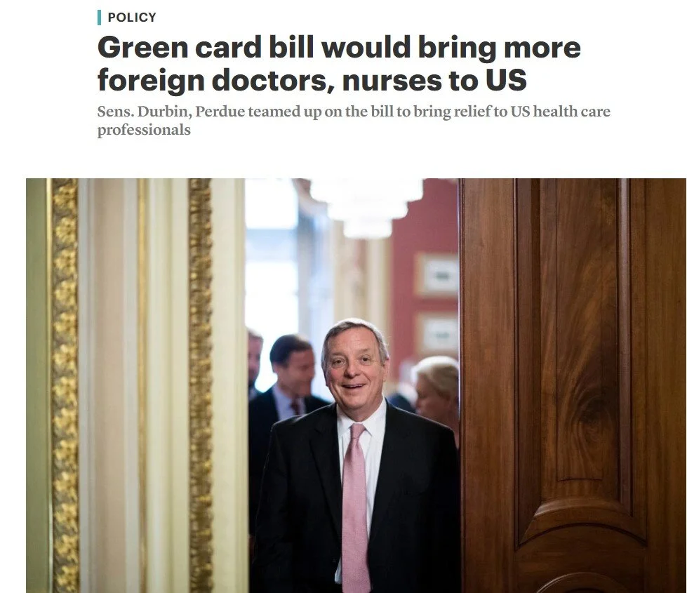 为了减低因为新冠病毒而造成医护人员不足所带来的影响,在4月30号的时候,多位民主及共和两党参议员共同推出了一项新的法案Healthcare Workforce Resilience Act,要求行政部门将过去未使用完的4万张职业绿卡额度提供给外籍医护人员使用。根据参议员的说明,这项法案将允许行政部门最多回朔两万五千张过去未使用的绿卡给外籍护士及 一万五千张未使用的绿卡给外籍医生使用。此外法案也要求移民局将过去未使用完的其他绿卡额度,提供给这些医护人员的家属使用。这项法案适用的对象将限制于总统宣布终止国家紧急状态后90天之前已经递交职业移民请求(I-140)的外籍医护人员。